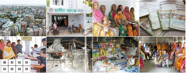 1. 다카의 그라민뱅크 본사에서 내려다본 시내 정경. 2슈루즈 마을 그라민뱅크의 입구. 3.대출을 받기 위해 차례를 기다리는 방글라데시 여인들.4. 대출기록 장부들. 모든 대출 관련 기록은 직접 손으로 쓴다. 5. 은행 내부의 모습. 지점장의 사인까지 받으면 대출 절차가 끝난다. 6. 대출자 중 상환 신용이 좋은 사람은 기업대출을 받을 수 있다. 사진은 대출금으로 차린 빵공장 내부. 7. 그라민뱅크에서 대출받아 개업한 식료품점. 8.대출 여성들과 함께 포즈를 취한 모습(가운데 오른쪽). 이들은 기자에게 ‘이곳 남성과 결혼해 함께 살자’고 했다. 다카=이진 객원기자 - 출처